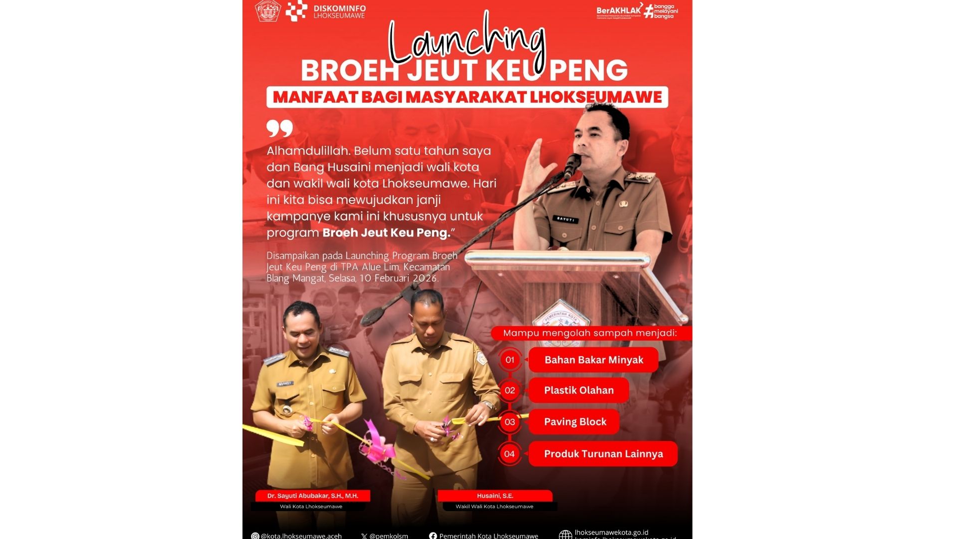 Pemerintah Kota Lhokseumawe resmi melaunching Program Broeh Jeut Keu Peng di TPA Alue Lim, Kecamatan Blang Mangat, Selasa (10/2/2026). Program ini merupakan salah satu langkah strategis Pemko Lhokseumawe dalam mengelola sampah menjadi produk bernilai guna sekaligus bernilai ekonomi bagi masyarakat.…