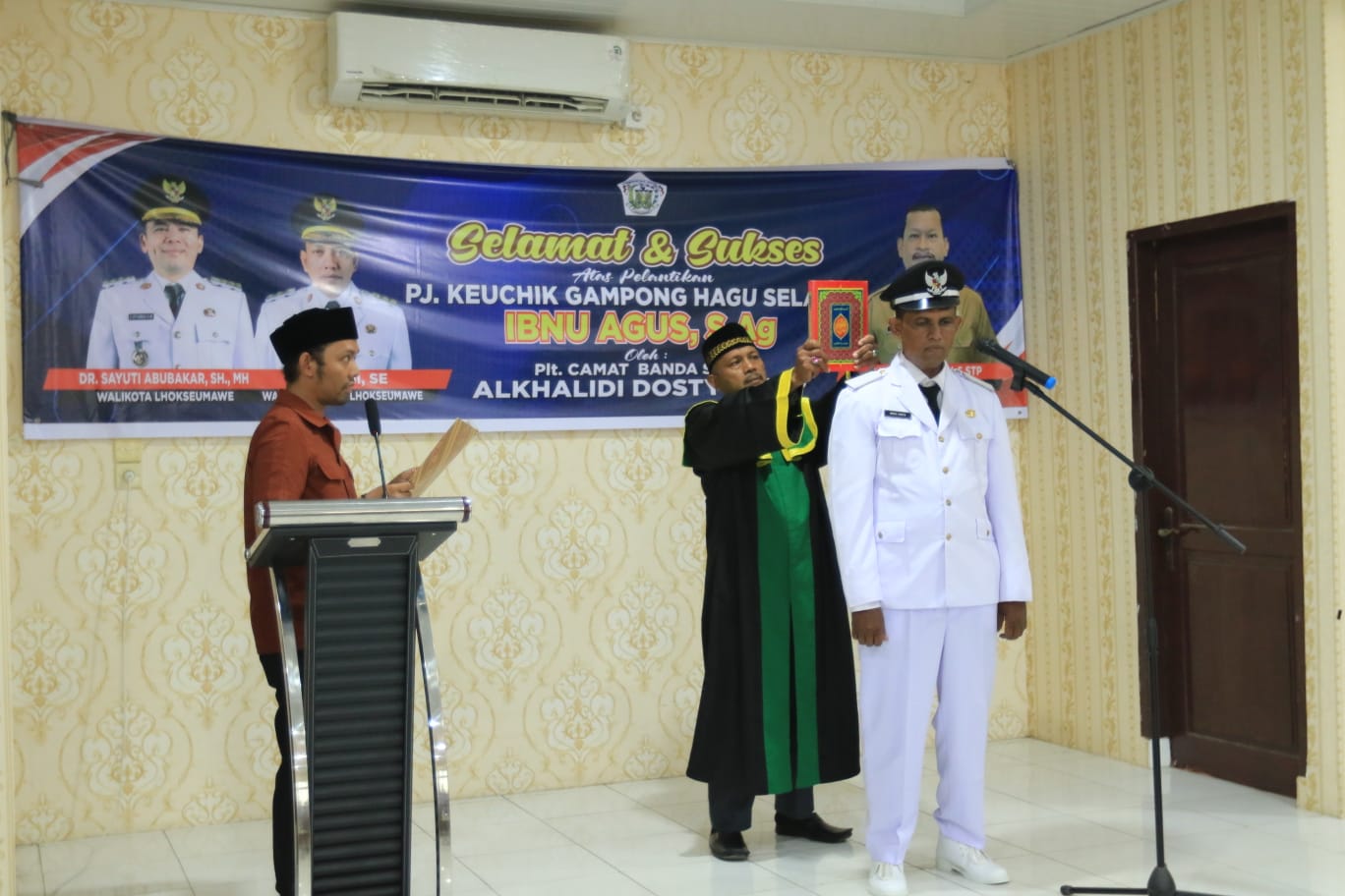 Lhokseumawe, 31 Oktober 2025 — Pemerintah Kecamatan Banda Sakti melaksanakan acara pelantikan Penjabat (Pj) Keuchik Gampong Hagu Selatan pada hari Jumat, 31 Oktober 2025, bertempat di Aula Kantor Camat Banda Sakti. Acara pelantikan tersebut dipimpin langsung oleh Plt. Camat Banda Sakti, Alkhalidi Dosty, S.STP, yang secara resmi melantik Pj Keuchik Hagu Selatan, Ibnu Agus, S. Ag untuk melanjutkan roda pemerintahan gampong hingga terpilihnya keuchik definitif. Pelantikan berlangsung dengan khidmat dan dihadiri oleh unsur Muspika Kecamatan Banda Sakti, para geuchik se-kecamatan, tokoh masyarakat, serta perangkat gampong.